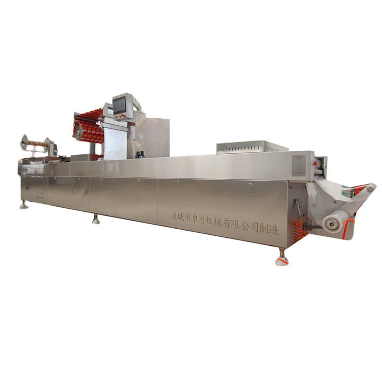 成型室由上、下工作室以及與所包裝產品對應的成型模具等組成。上工作室由螺栓固定在機架上,下工作室在氣缸的帶動下,可以上下往復運動。上工作室內裝加熱板。成型加熱溫度通過溫控儀和熱電耦控制。用戶可以在觸摸屏上很方便的設定成型溫度。先下工作室上行到達它的上位置。上、下工作室通過硅膠密封墊完全密封后,加熱板對底膜加熱至設定的成型溫度,然后下工作室抽真空。已加熱的底膜受拉伸,沉入成型模成為與被包產品對應的幾何形狀。使用的底膜質量,材料和厚度、硬度不同,成型溫度也不同,合理的成型溫度由試驗確定。