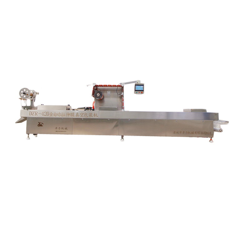 全自動拉伸膜真空包裝機底膜和頂膜運動時表面還應適當張緊,不然成型時和封口時,在封口區會出現折皺以至影響封口質量。張力調整由張力調整機構完成。張力調整機構裝在滾筒軸上,由彈簧和調整螺母和軟聚乙烯制動片組成。通過調整可以改變滾筒所需的回轉力矩。調整方法:軸向向里調動張力調整螺母,膜表面張力增大。