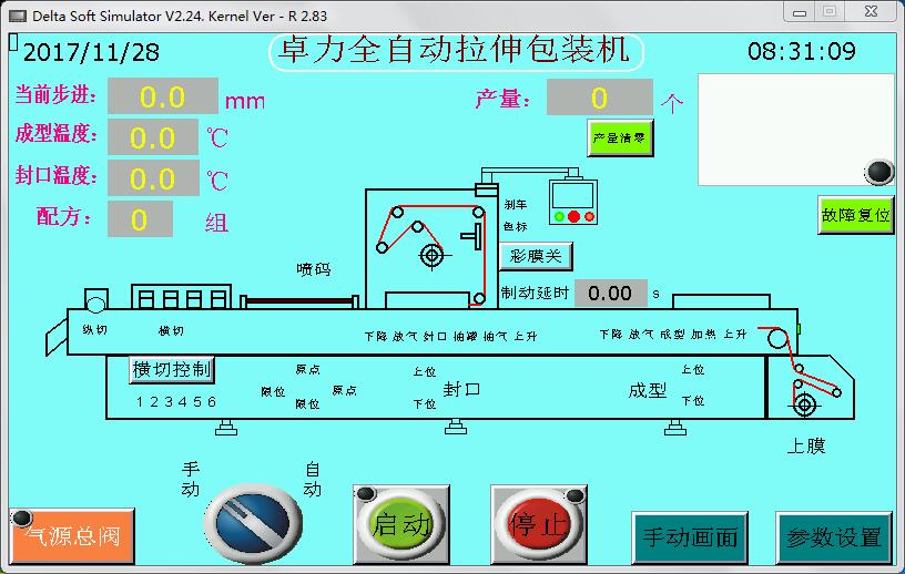 ——在顯示的日期下方依次顯示當前步進、成型溫度、封口溫度、配方等信息,當包裝機供電后,如果“手動畫面”中的“加熱開關”在開的位置,包裝機將自動根據所設定的溫度自動加溫并控溫。配方是噴碼機構噴碼的依據,在“參數設置”中設定。